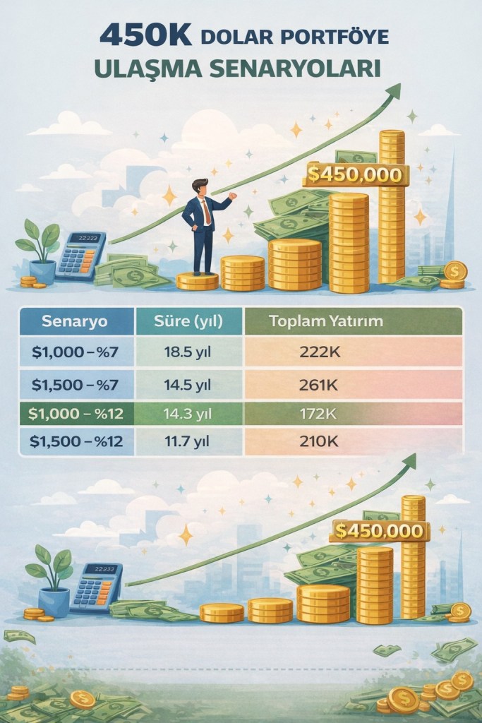Peki, örnek olayımıza geri dönelim. Sıfırdan başlıyorsunuz ve işinizden istifa ederek emekli ve özgür olabilmeniz 450 bin Dolara ihtiyacınız var. Bu paraya ne kadar zamanda ulaşabilirsiniz?