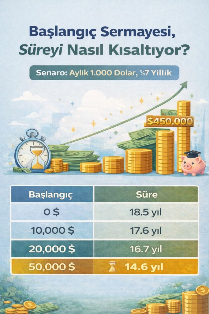 Tablodan görüldüğü üzere 1.000 Dolar yatırılıp %7 getiri elde edilen senaryoya kıyasla başlangıçta biraz sermaye varsa işler çok daha kolaylaşıyor ve yalnızca hedef miktarın %10’unun biraz üzerinde bir sermaye ile 4 yıl kadar kısaltılabiliyor. Bu sayılar aynı zamanda özellikle küçük portföy sahiplerinin neden yatırıma kafa yormak yerine gerçek hayatta para kazanmaya yorması gerektiğinin de bir başka kanıtı.