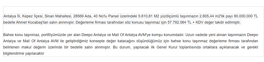 TRGYO önce 28 Ocak günü Mall of Antalya’ya (MOA) komşu arazinin 2.800 metrekarelik kısmını 80 milyon TL’ye satın aldığını duyurdu. Bu işlem TRGYO ölçeğinde bir şirket açısından oldukça ufak sayılabilecek nitelikte olsa da, Deepo Antalya ve MOA ile geliştirilmekte olan konsepte değer katacağı ve durumun ilk Genel Kurul’da açıklanacağının ifade edilmesi şirketin nakitte bekleme pozisyonundan çıkarak yeni projeler geliştirmeye başlaması açısından önemli bir sinyaldi. Ancak bugün konumuz bu değil. Genel Kurulda daha fazla bilgi sahibi olduktan sonra yorum yapmak doğru olacaktır. Şirket sözkonusu arsaya rayiç değerinin (57 milyon TL) üzerinde bir değer ödedi ve özellikle Genel Kurulu işaret ettiyse buradan muhakkak bir hikaye çıkacak diye düşünüyorum.