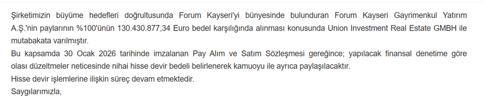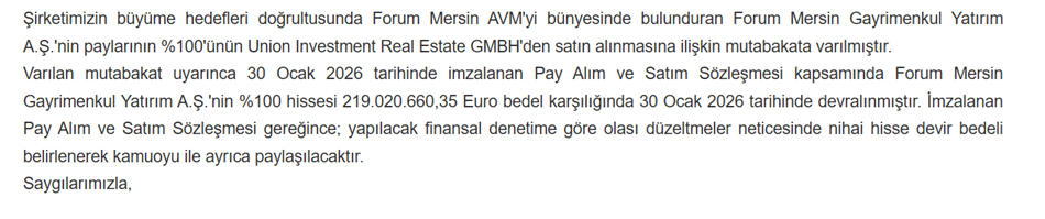 Henüz bu haberin dumanı burnunda tüterken 30 Ocak günü şirketin yayımladığı iki ayrı KAP bildirimiyle Forum Mersin ve Kayseri’nin devralınmasına ilişkin sözleşmeleri imzaladığını duyurması sadece şirket yatırımcıları açısından değil, sektörü takip eden herkes açısından ilgi çeken bir haber oldu.